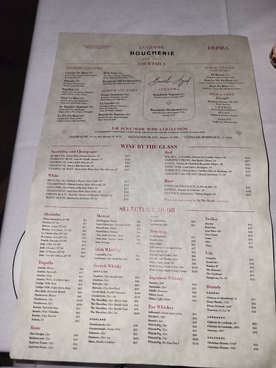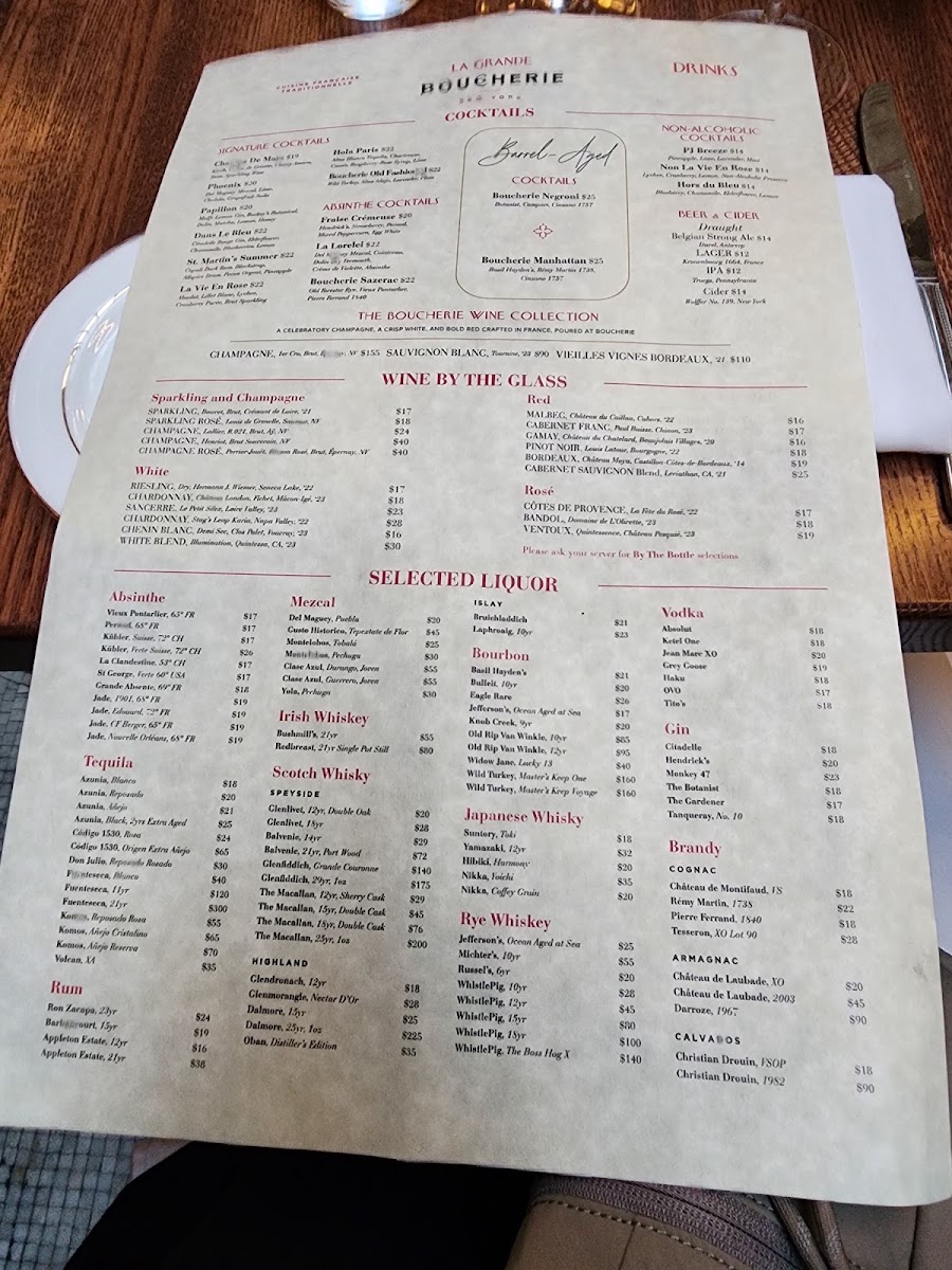 The dessert offerings provide a fitting finish, with traditional choices like Boucherie Crème Brûlée and Chocolate Profiteroles featuring a silky cream filling, highlighting a subtle blend of sweetness that resonates with the classic French dining experience.
